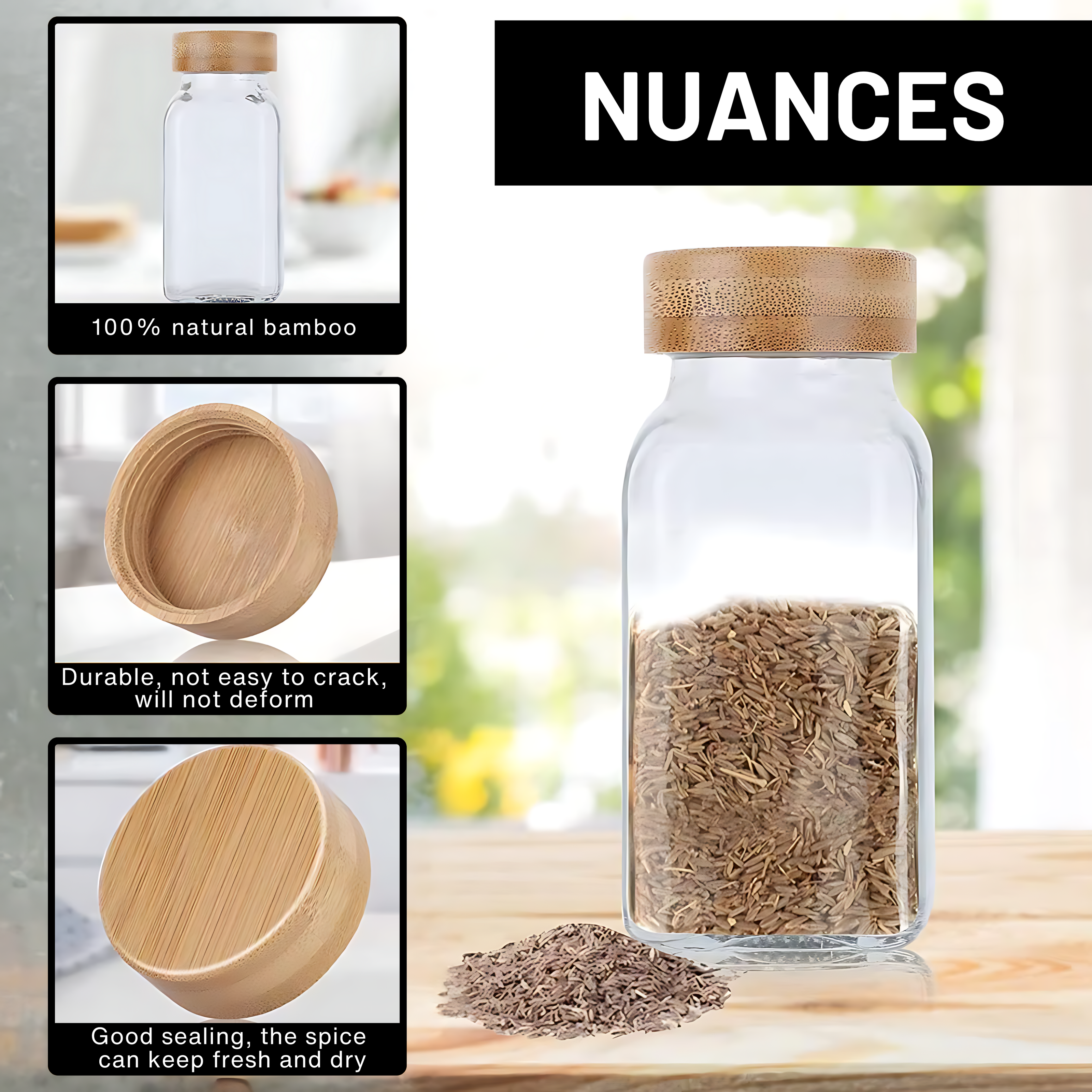 - Our High quality Spice Containers Crafted from premium glass, renowned for its exceptional durability and resistance to thermal shock, each jar is a testament to superior craftsmanship. The lids are crafted from eco-friendly bamboo, adding a touch of natural elegance to your kitchen decor, not only exude natural elegance but also provide a robust seal to safeguard the freshness and potency of your spices.